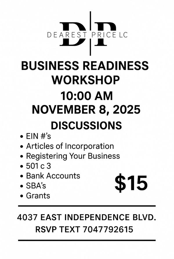 Dearest Price LLC Business Readiness Workshop is designed to equip aspiring entrepreneurs, nonprofit leaders, and small business owners with the foundational tools needed to start and sustain successful ventures. Scheduled for November 8, 2025, at 10:00 AM at 4037 East Independence Blvd, this engaging session will walk participants through essential steps such as obtaining EIN numbers, filing Articles of Incorporation, registering your business, and understanding the process of forming a 501(c)(3). Attendees will also learn about bank account setup, SBA resources, and grant opportunities to secure funding. For just $15, participants will gain practical guidance, real-world insights, and access to resources that simplify the often-overwhelming process of launching or formalizing a business. RSVP by texting 704-779-2615 to reserve your spot and take the first step toward building your vision with confidence.